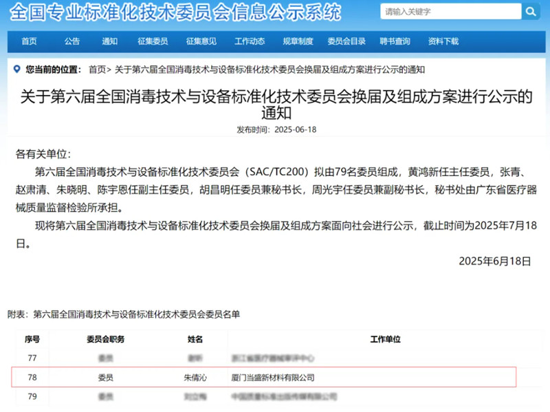 厦门当盛新材料有限公司技术总监朱倩沁成功获任第六届全国消毒技术与设备标准化技术委员会(SAC/TC 200)委员,并同时担任国际标准化组织医疗产品灭菌技术委员会(ISO/TC 198)的中国注册专家。